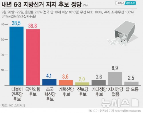 내년 지방선거 지지후보…민주 38.5%·국힘 36.8%, 오차범위 내[창간특집 여론조사] 작성자관리자 등록일 25-10-01 조회57회 출처 뉴시스 보도일자 25.10.01 본문 https://n.news.naver.com/mnews/article/003/0013516788?sid=100 차기 대통령 적합도…장동혁 18.3%, 김민석 14.3%, 조국 12.4%[창간특집 여론조사] 민선 8기 안동시, '잘하고 있다’ 68%...시민 10명 중 9명은 '살기 좋다' 목록