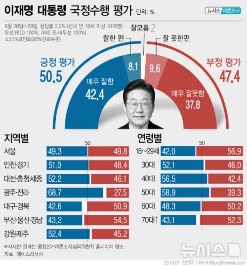 이 대통령 국정수행 '잘한다' 50.5% '잘못한다' 47.4%[창간특집 여론조사] 작성자관리자 등록일 25-10-01 조회66회 출처 뉴시스 보도일자 25.10.01 본문 https://n.news.naver.com/mnews/article/003/0013516790?sid=100 "조희대 대법원장 사퇴 반대" 47.5% "찬성" 43.9% 팽팽 [에이스리서치] 민주당 41.5% 국민의힘 29.0%…당대표 직무평가, 정청래 42.3%·장동혁 40.4%[창간특집 여론조사] 목록