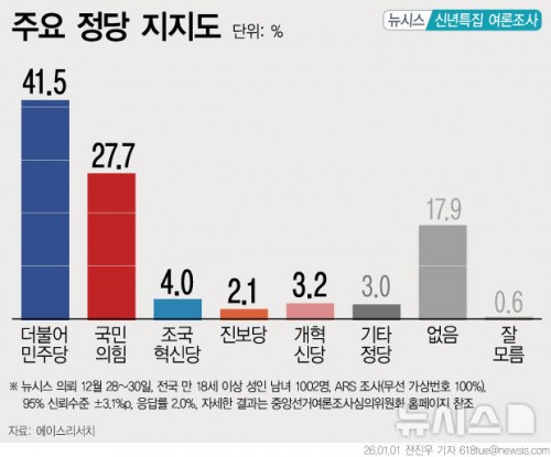 정당 지지도 민주 41.5%, 국힘 27.7%…석달전 대비 민주 동일, 국힘 1.3%p↓[신년여론조사] 작성자관리자 등록일 26-01-05 조회8회 출처 뉴시스 보도일자 26.01.01 본문 https://n.news.naver.com/article/003/0013686909?type=main 6·3 지선 '정부·여당에 힘 실어야' 48.9% '현 정부 견제·심판' 44.7%[신년여론조사] 李대통령 '잘하고 있다' 52.9%·'못하고 있다' 44.1%[신년여론조사] 목록