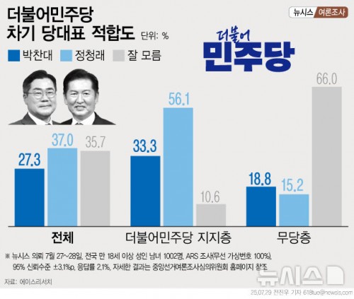 민주당 대표 적합도…與 지지층에서 정청래 56.1%·박찬대 33.3%[에이스리서치] 작성자관리자 등록일 25-07-29 조회101회 출처 뉴시스 보도일자 25.07.29 본문 https://n.news.naver.com/mnews/article/003/0013389927?sid=100 이 대통령 국정수행 '잘한다' 61.2% '잘못한다' 35.5%[에이스리서치] 국힘 당대표 적합도…국힘 지지층에서 김문수 34.9%, 장동혁 19.8%, 조경태 11.0%[에이스리서치] 목록