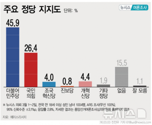 민주 45.9%, 국힘 26.4%…두 달 전 대비 민주 4.4%p↑, 국힘 1.3%p↓[에이스리서치] 작성자관리자 등록일 26-03-04 조회142회 출처 뉴시스 보도일자 26.03.04 본문 https://n.news.naver.com/mnews/article/003/0013799535?sid=100 6·3 지방선거 '민주당 후보에 투표' 46.9% '국민의힘 후보에 투표' 31.5%[에이스리서치] 이 대통령 국정수행 '잘 하고 있다' 58.6%·…두 달만에 5.7%p↑[에이스리서치] 목록