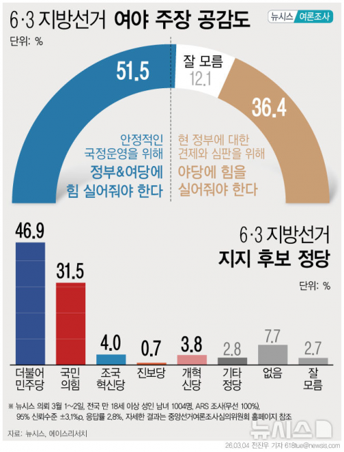 6·3 지방선거 '민주당 후보에 투표' 46.9% '국민의힘 후보에 투표' 31.5%[에이스리서치] 작성자관리자 등록일 26-03-04 조회162회 출처 뉴시스 보도일자 26.03.04 본문 https://n.news.naver.com/mnews/article/003/0013799539?sid=100 행정통합 찬성 49.6% 반대 29.9%…충청권은 찬성 44.8% 반대 40.4%, 오차범위 내[에이스리서치] 민주 45.9%, 국힘 26.4%…두 달 전 대비 민주 4.4%p↑, 국힘 1.3%p↓[에이스리서치] 목록