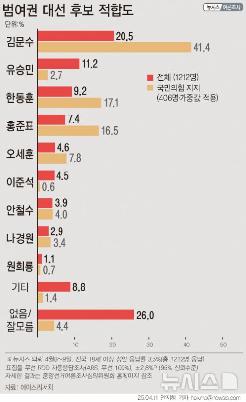 범여권 후보 중 김문수 20.5%·범야권 후보 중 이재명 46.5%[에이스리서치] 작성자관리자 등록일 25-04-11 조회166회 출처 뉴시스 보도일자 25.04.11 본문 https://n.news.naver.com/mnews/article/003/0013177417?sid=100 민주 43.2%·국민의힘 33.5%…민주 0.3%p↑·국힘 5.2%p↓[에이스리서치] 이재명 52.0%·김문수 36.8%…李 52.2%·홍준표 34.0%, 李 53.5%·오세훈 31.9%[에이스리서치] 목록