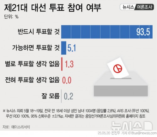 유권자 93.5% '반드시 투표'…'가능하면 투표' 5.1%[에이스리서치] 작성자관리자 등록일 25-05-20 조회114회 출처 뉴시스 보도일자 25.05.20 본문 https://n.news.naver.com/mnews/article/003/0013252359?sid=100 [6·3대선] 이재명 46.5%-김문수 40.4%…지지층 결집 '판세 요동' 민주당 46.5%·국민의힘 37.2%…민주 2.1%p↓·국힘 5%↑[에이스리서치] 목록
