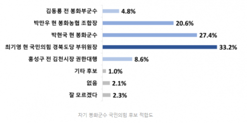 “봉화군수 선거, ‘최기영·박현국 선두권 오차범위 내 접전’…국힘 압도적 우세 속 내부 경쟁 격화” 작성자관리자 등록일 26-03-24 조회119회 출처 경상매일신문 보도일자 26.03.23 본문 https://www.ksmnews.co.kr/news/view.php?idx=596474 6·3 지선 국힘 후보 적합도… 경주시장 선거 주낙영 vs 박병훈 초박빙 혈투 시작 국힘 절대적 우위 속 격돌…세대별 맞춤 전략이 승부수.. 목록