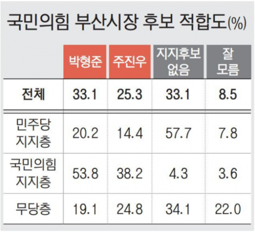 박형준, 주진우에 오차범위 밖 우세… 관건은 부동층 향배 [6·3 지방선거 부산 여론조사] 작성자관리자 등록일 26-04-07 조회54회 출처 부산일보 보도일자 26.04.05 본문 https://n.news.naver.com/mnews/article/082/0001374472?sid=100 여야 부산시장 후보 다자대결…전재수 40.6%, 박형준 23.6%, 주진우 15.6%, 이재성 6.8% [6·3 지방선거 부산 여론조사] 6·3 지선 국힘 후보 적합도… 경주시장 선거 주낙영 vs 박병훈 초박빙 혈투 시작 목록