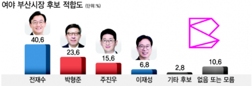 여야 부산시장 후보 다자대결…전재수 40.6%, 박형준 23.6%, 주진우 15.6%, 이재성 6.8% [6·3 지방선거 부산… 작성자관리자 등록일 26-04-07 조회51회 출처 부산일보 보도일자 26.04.05 본문 https://n.news.naver.com/mnews/article/082/0001374467?sid=100 전재수 48% vs 박형준 34.9%, 전재수 47.7% vs 주진우 36.4%[6·3 지방선거 부산 여론조사] 박형준, 주진우에 오차범위 밖 우세… 관건은 부동층 향배 [6·3 지방선거 부산 여론조사] 목록