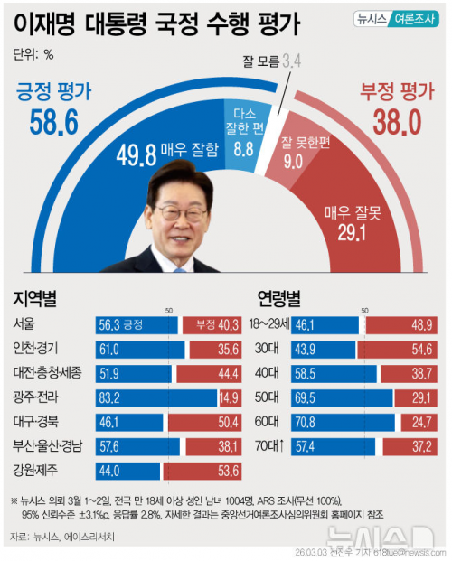 이 대통령 국정수행 '잘 하고 있다' 58.6%·…두 달만에 5.7%p↑[에이스리서치] 작성자관리자 등록일 26-03-04 조회135회 출처 뉴시스 보도일자 26.03.04 본문 https://n.news.naver.com/mnews/article/003/0013799533?sid=100 민주 45.9%, 국힘 26.4%…두 달 전 대비 민주 4.4%p↑, 국힘 1.3%p↓[에이스리서치] 주낙영 40.6% 선두…경주시장 판세 ‘1강 1중 다약’ 목록