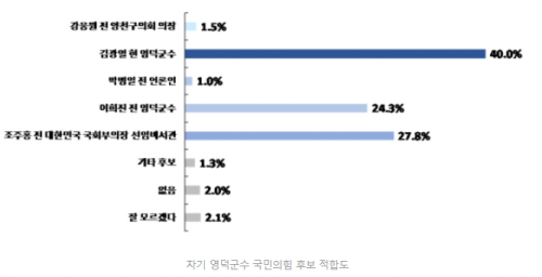 김광열 현직 프리미엄 선두…조주홍·이희진 ‘추격’ 작성자관리자 등록일 26-03-23 조회109회 출처 경상매일신문 보도일자 26.03.23 본문 https://www.ksmnews.co.kr/news/view.php?idx=596250 김광열 ‘오차범위 밖 우세’…2위권 결집 여부가 막판 변수로 부상 6·3 전국동시지방건서 국민의힘 예천군수 후보 적합도… 김학동 35.0%·도기욱 31.7%·안병윤 25.2% 목록