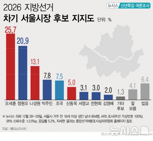 서울시장 지지도…오세훈 25.7%, 정원오 20.9%, 나경원 13.1%, 박주민 7.8%[신년여론조사] 작성자관리자 등록일 26-01-05 조회30회 출처 뉴시스 보도일자 26.01.01 본문 https://n.news.naver.com/mnews/article/003/0013686918?sid=100 서울시장 가상 양자 대결…정원오 40.9% 오세훈 40.4%[신년여론조사] 새해 대한민국 "어려워질 것" 46.5%…"나아질 것" 37.4%[신년여론조사] 목록